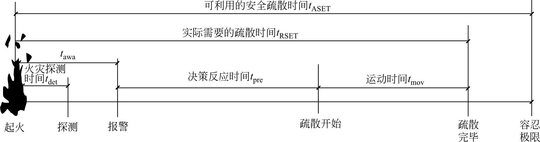 建筑物发生火灾时,人员疏散时间的组成如图1-25所示。由图可见,人员疏散过程可分解为三个阶段:察觉火警、决策反应和疏散运动。实际需要的疏散时间 t RSET 取决于火灾探测报警的敏感性和准确性 t awa ,察觉火灾后人员的决策反应 t pre ,以及决定开始疏散行动后人员的疏散流动能力 t mov 等,即