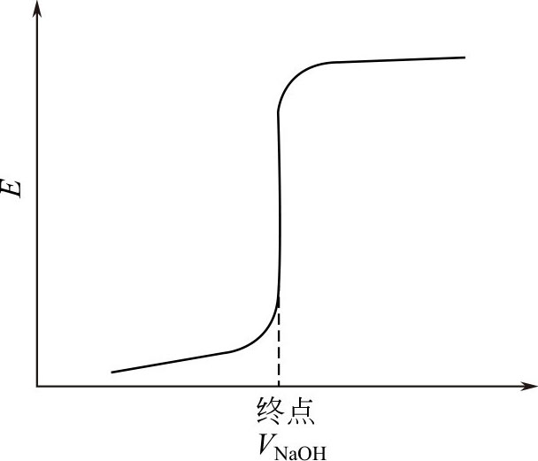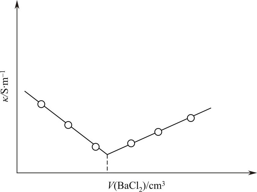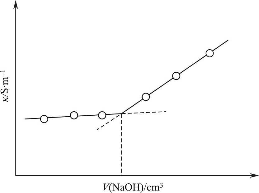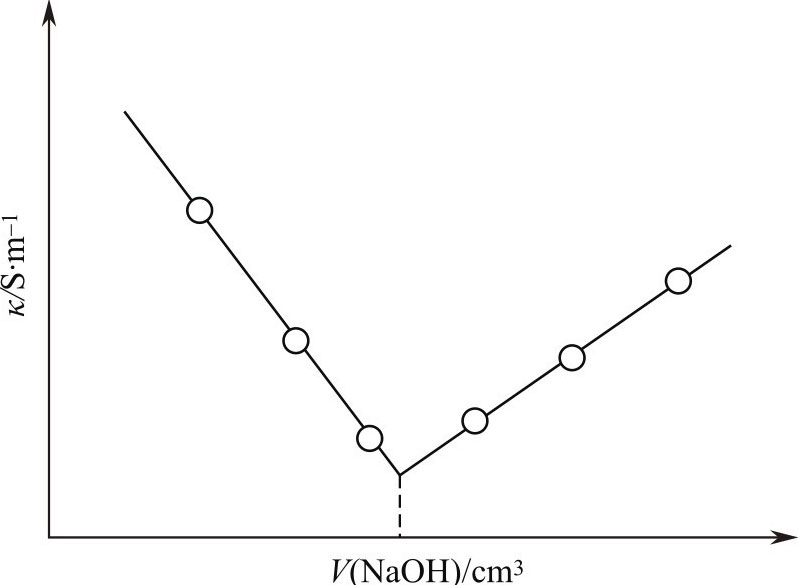 在盐酸溶液中加入NaOH溶液,相当于用Na + 取代H + 去负担传导电荷的任务,由于Na + 的迁移率是5.19,H + 为36.3,即Na + 的迁移速率远小于H + ,这种代替必然导致溶液电导率的减小。当到达终点后,再加NaOH,等于增加了溶液中的导电离子(因为这时HCl已被中和完毕),故溶液的电导率重新增加。如果用溶液的电导率对所加入的NaOH的体积作图,可得如图1-4-10的图形。在实际测量中,只要在等当点前后各测出若干数据分别作两条直线,其交点即为等当点。