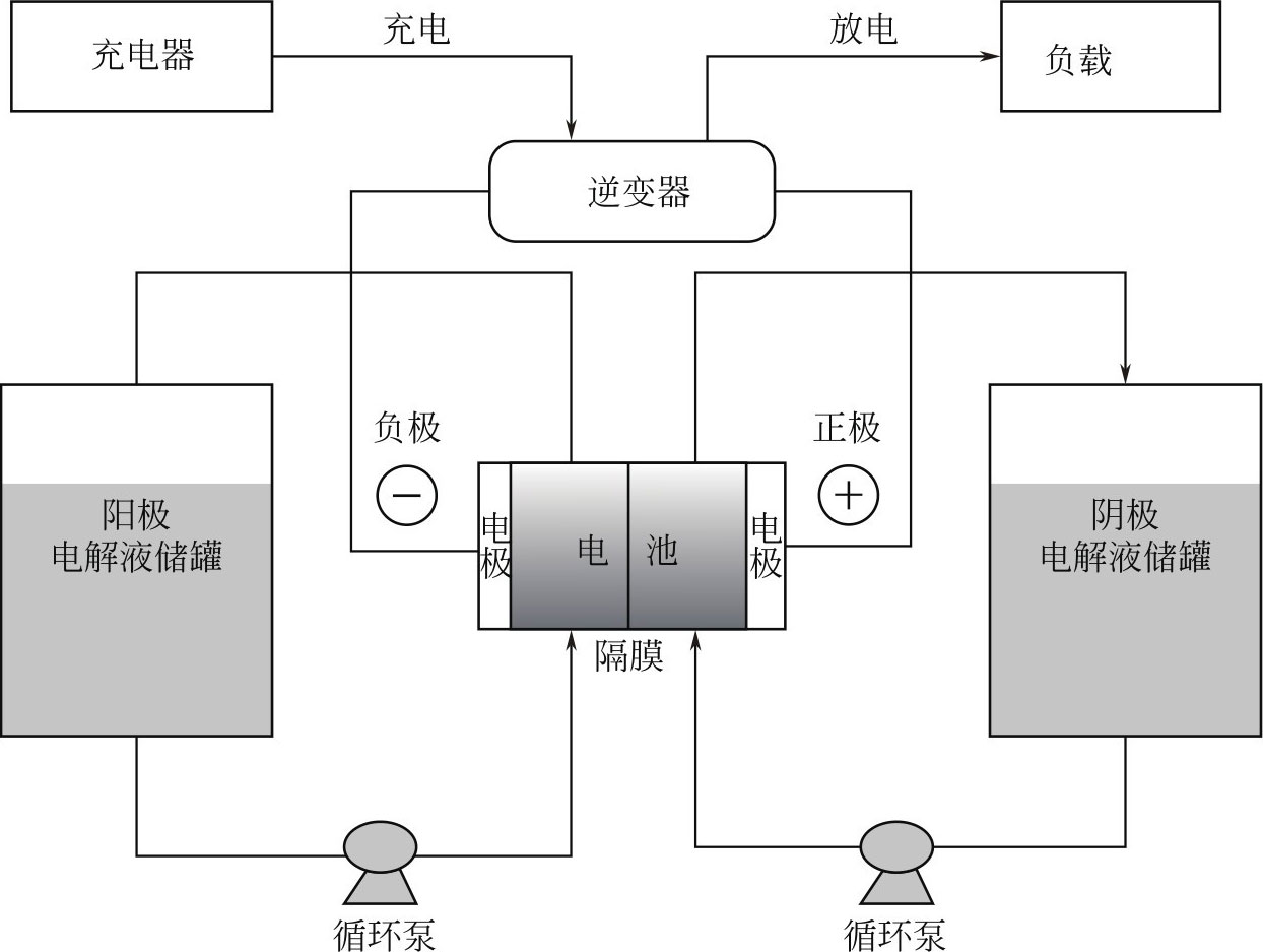 图1-4-30是液流电池的原理图,正极和负极电解液分别装在两个储罐中,利用送液泵使电解液通过电池循环。在电堆内部,正、负极电解液用离子交换膜(或离子隔膜)分隔开,电池外接负载和电源。电堆和电解液储罐可以分别放置,因此可因地制宜放置。