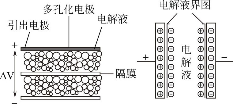 超级电容器(supercapacitor,ultracapacitor)又叫双电层电容器(electrical double-layer capacitor)、电化学电容器(electrochemcial capacitor,EC)、黄金电容、法拉电容,通过极化电解质来储能。它是一种电化学元件,但在其储能的过程中并不发生化学反应,这种储能过程是可逆的,也正因为如此,超级电容器可以反复充放电数十万次。超级电容器可以被视为悬浮在电解质中的两个无反应活性的多孔电极板,在极板上加电,正极板吸引电解质中的负离子,负极板吸引正离子,实际上形成两个存储层,被分离开的正离子在负极板附近,负离子在正极板附近(见图1-4-31)。