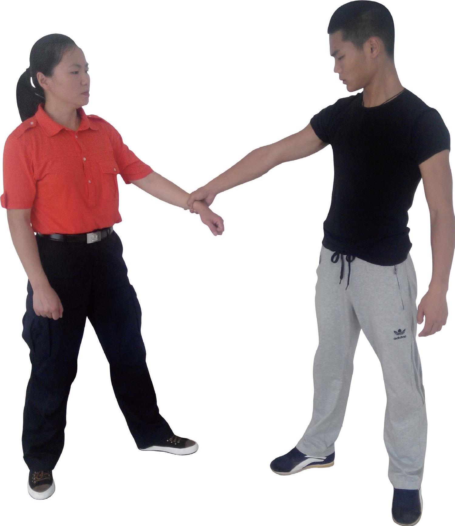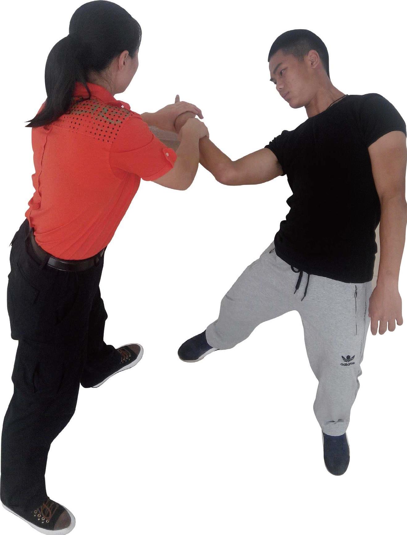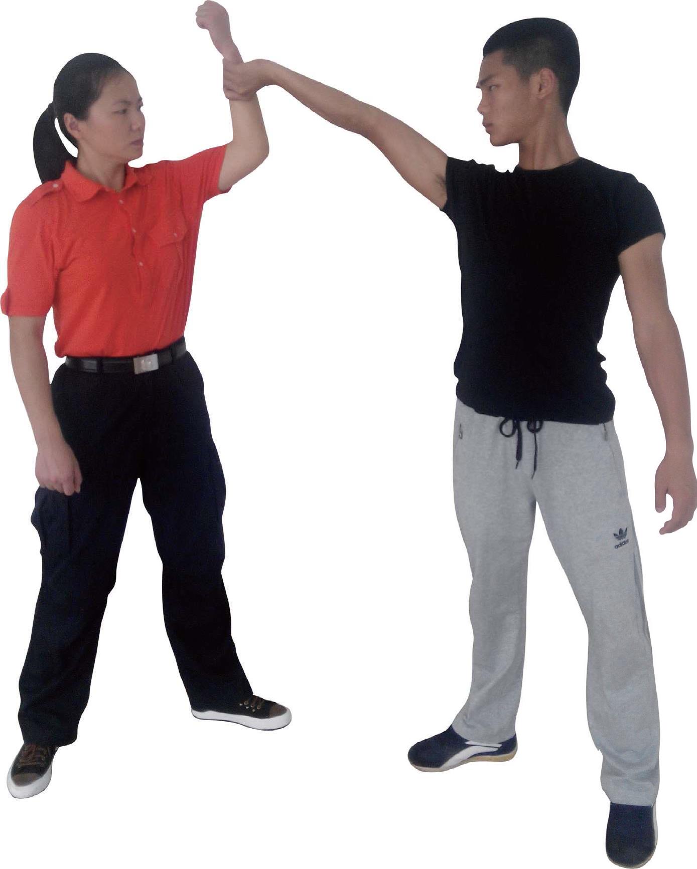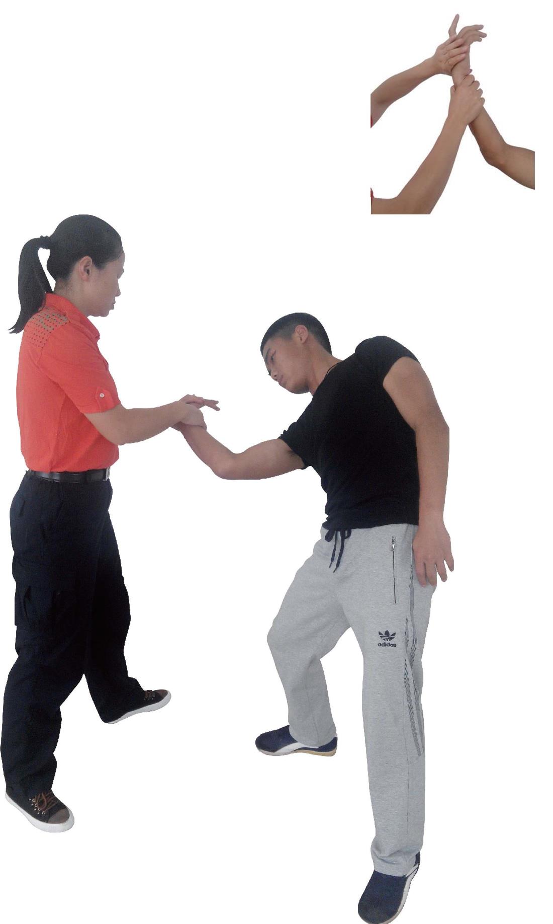 (2)左手迅速屈臂内收上抬,使对方左手腕成反关节难以发力的状态。