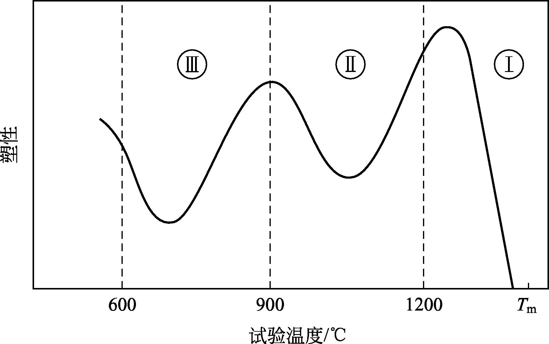 Ⅰ区( T m ~1200℃):在高于1300℃时,由于晶界开始初熔导致塑性陡降,此温度区间塑性的降落与应变速度关系不大。