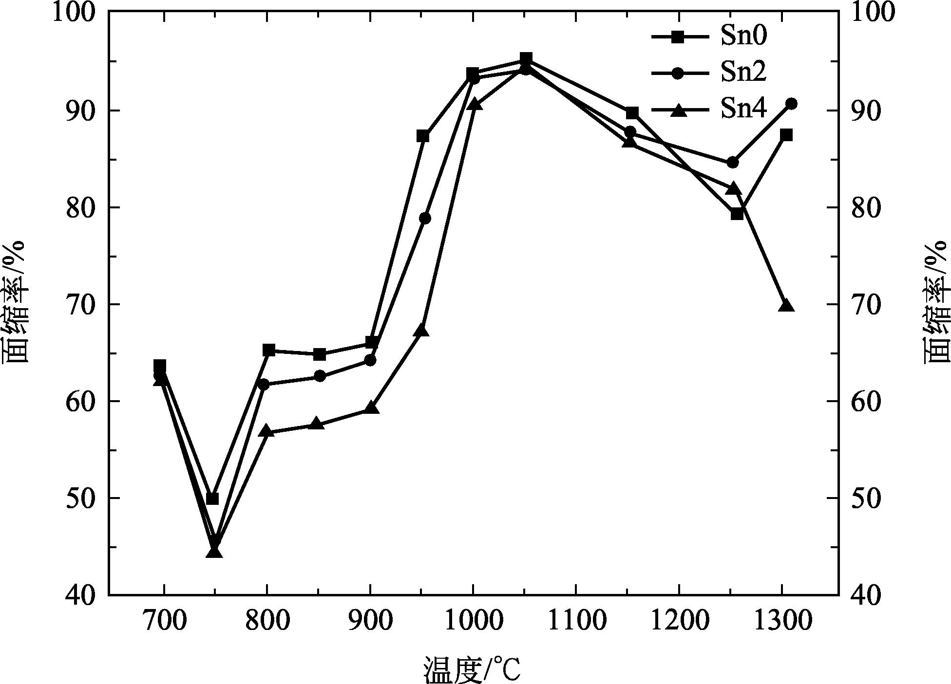 b.温度小于1000℃特别是在950~800℃之间,随Sn含量增加,热塑性明显降低。