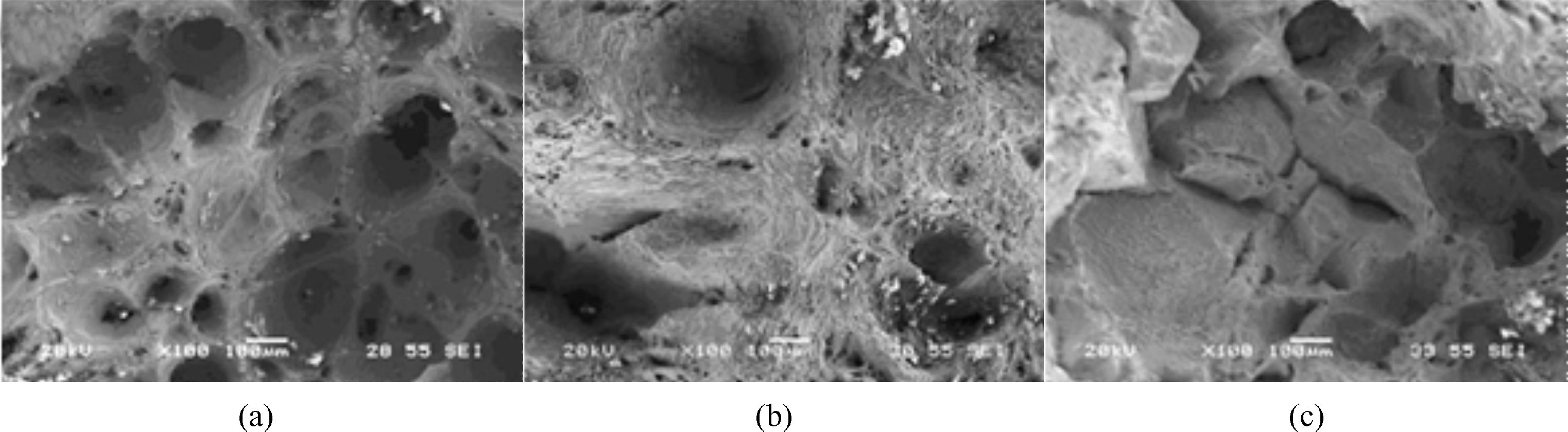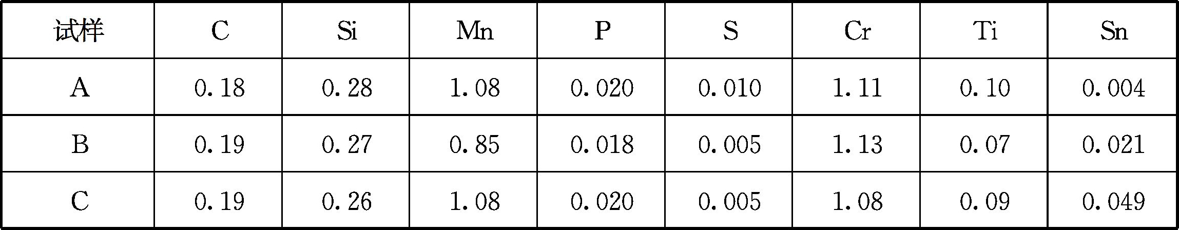 图2-9为950℃的试样断口形貌。试样A、B的断口为塑性断裂,表面有许多大而深的塑坑以及韧窝;试样C断口形貌呈典型冰糖状,属沿晶脆性断裂。说明试样中Sn≥0.049%显著降低其热塑性而造成脆性断裂;当Sn≤0.021%时,对20CrMnTi钢的热塑性影响较小。