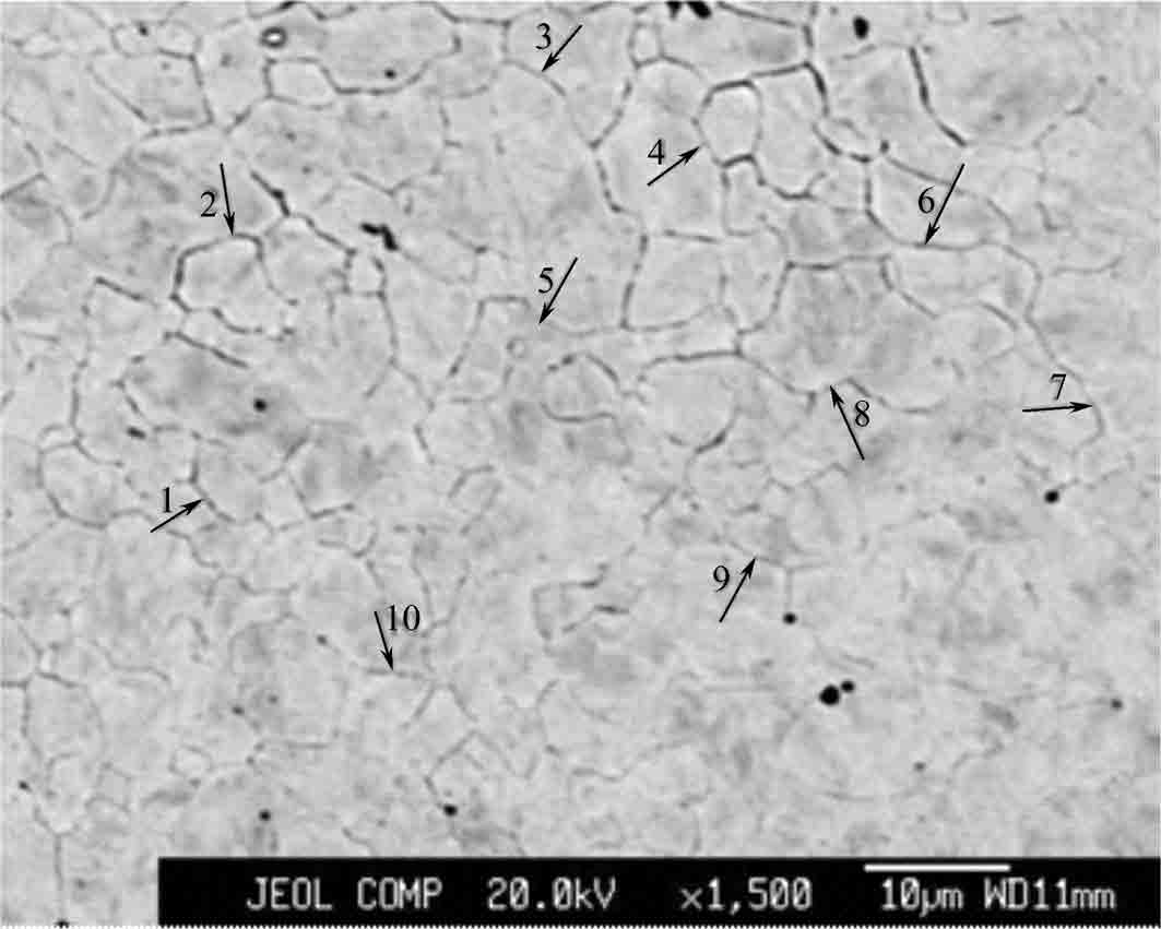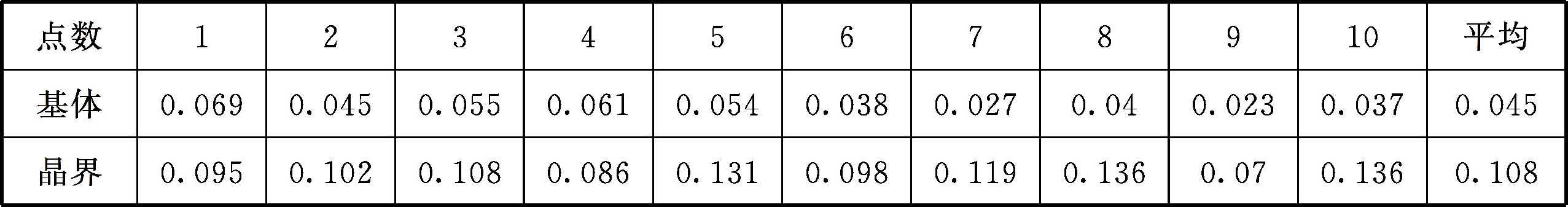电子探针的结果如表2-2和图2-10所示,可见晶界区域Sn的平均含量明显高于晶粒内部,表明Sn的分布出现晶界偏聚现象。