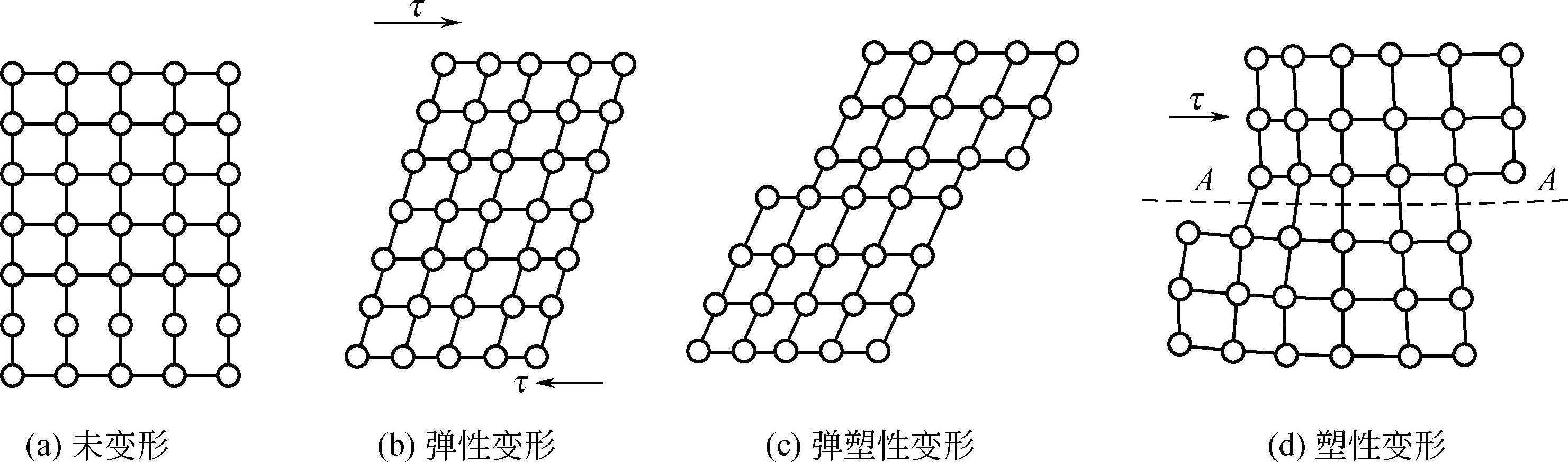 对金属材料施加外力时,在晶面上产生的应力可以分解为正应力( σ )和切应力( τ )。其中,正应力垂直于晶面,会使金属材料产生弹性变形或断裂;切应力与晶面平行,并可以使晶格发生畸变,使得晶粒的一部分相对另一部分沿着某一晶面(即滑移面,也是密排面)产生相对滑动,从而引起晶粒内部发生塑性变形。对于单晶体而言,其滑移示意图如图3-2所示。在图3-2(b)中可以看出,切应力较小,撤除所加外力,原子就会回到原来所在位置,单晶粒发生弹性变形;若力度加大,原子则会产生较大的滑移,撤回所加外力,原子也回不到原来的位置,变形亦不会消失,而产生塑性变形。一般来说,金属的滑移难易度与金属的滑移系多少有关,滑移系越多,金属越容易变形,其塑性也就越好,因此,拥有面心立方结构的铜合金要比体心立方结构的铁的塑性好。