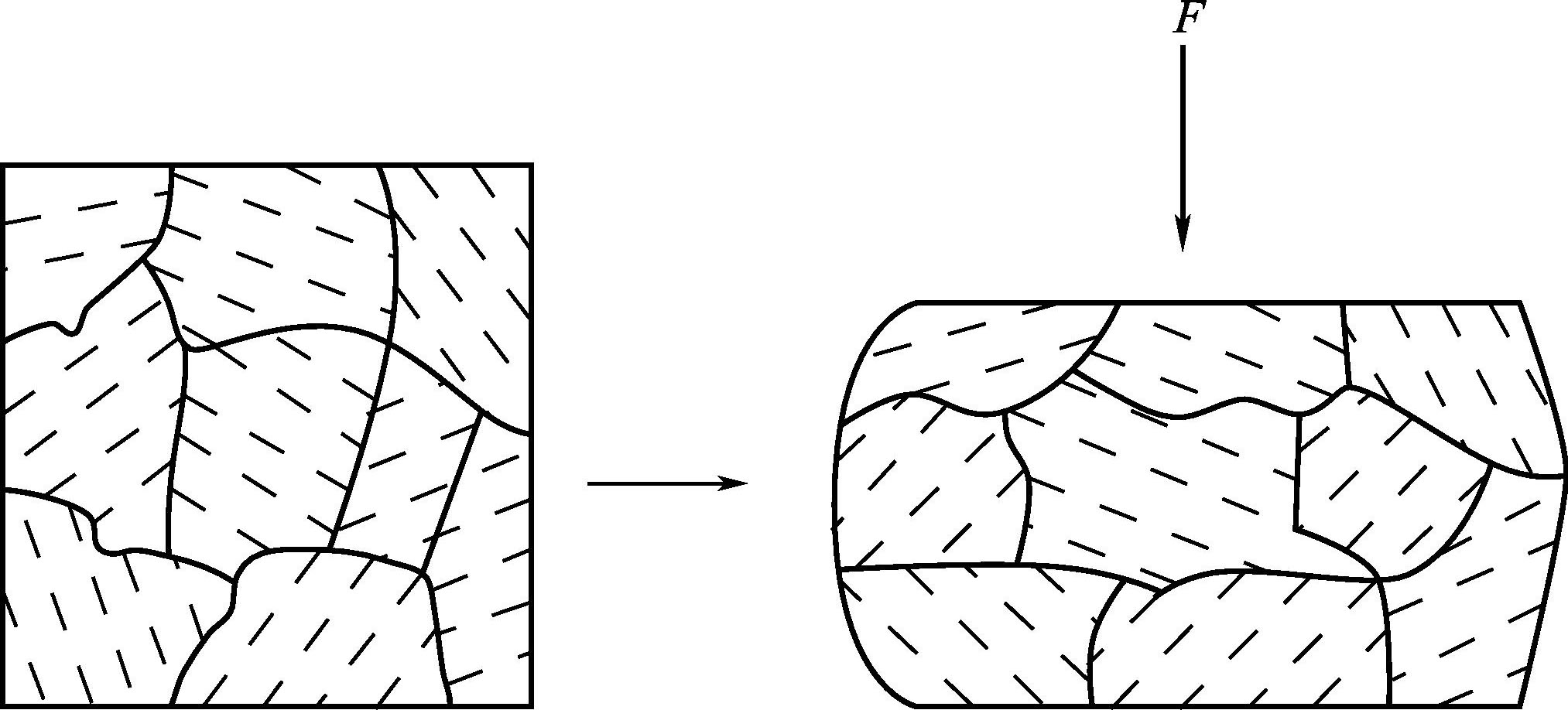 首先,多晶体在塑性变形过程中,晶界的存在会对其变形产生一定的阻碍作用。晶界是结构相同而取向不同晶粒之间的界面。在晶界上,原子排列从一个取向过渡到另一个取向,晶界处原子排列处于过渡状态,会有大量的晶体缺陷,因此,所产生的位错在此处滑移会受到一定的阻碍,此处的塑性变形抗力较高,变形难以进行。因此,我们可以得出结论,金属材料的晶粒越细小,晶界相对也就越多,对位错的阻碍作用也就更强烈,因此,细化晶粒可以使得合金的强度得到一定程度的提高。其次,多晶体的塑性变形还必须协调不同位向的晶粒。由于不同晶粒的位向不同,因此,在塑性变形过程中,各个晶粒的受力情况也有所不同,有的晶粒会优先产生滑移,而另外一些晶粒的滑移就相对较晚,因此,任何一个晶粒的滑移都会受到周围晶粒不同程度的影响,只有当外力大到能克服各个晶粒之间的影响,使得所有晶粒达到协调,不但满足了自身的滑移条件,而且保持了多晶体的结构连续性,才能使材料发生塑性变形。最后,由于各个晶粒的大小、形状、位置的不同,造成晶粒的变形是不均匀的。图3-3所示为多晶体塑性变形的示意图。在材料的外侧,晶粒的变形量较大,在材料心部,晶粒的变形量则相对较小,这就造成每个晶粒的形变量与晶粒所在的位置有很大关系。