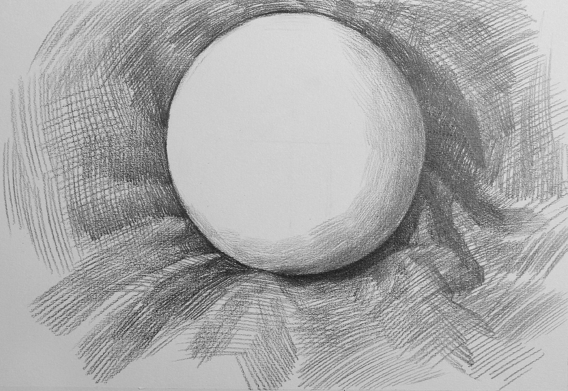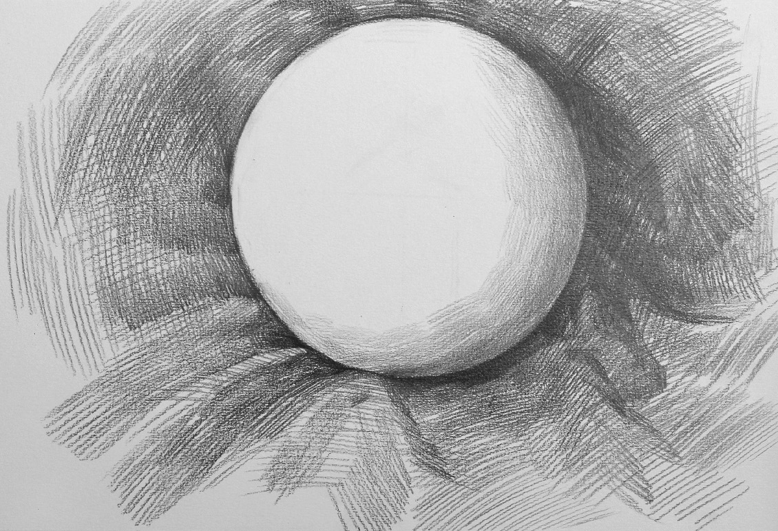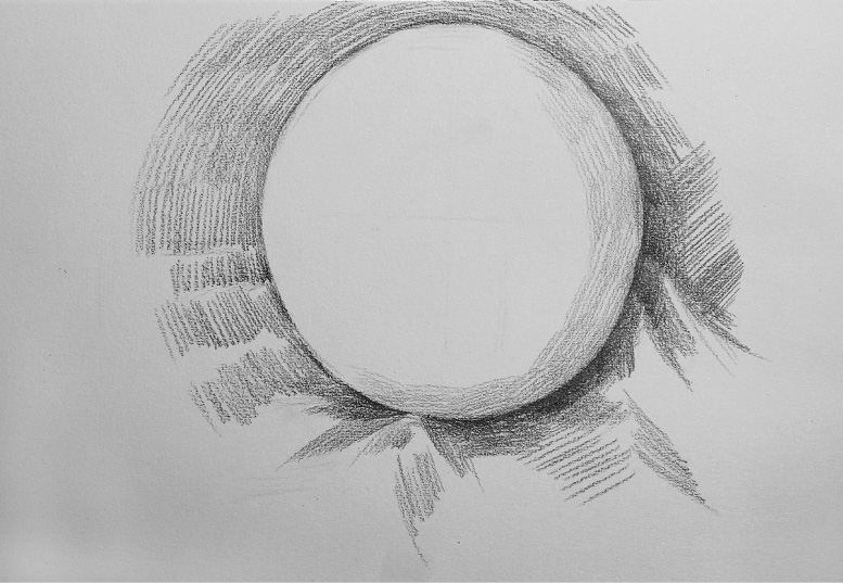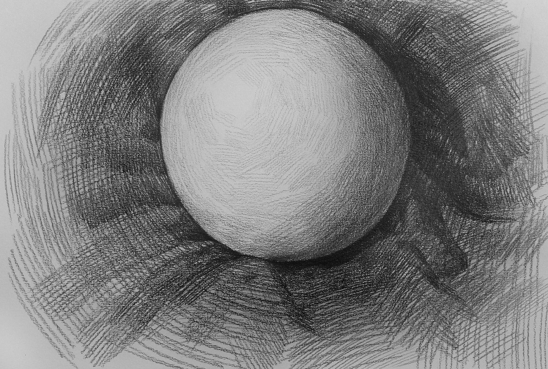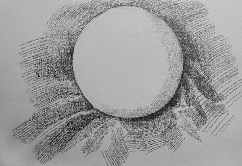 暗部处理 :选择一个位置,作为每一次刻画的起笔位置,本案例选择圆球体左上角的明暗交界线起点位置,每一次刻画都从此处下笔,顺着圆球体的形状向内用笔,顺着圆球体边线的形状向外画空间调子。本步骤的主要内容是通过暗部调子的轻重区别明确暗部的丰富变化。