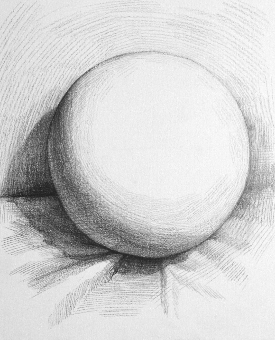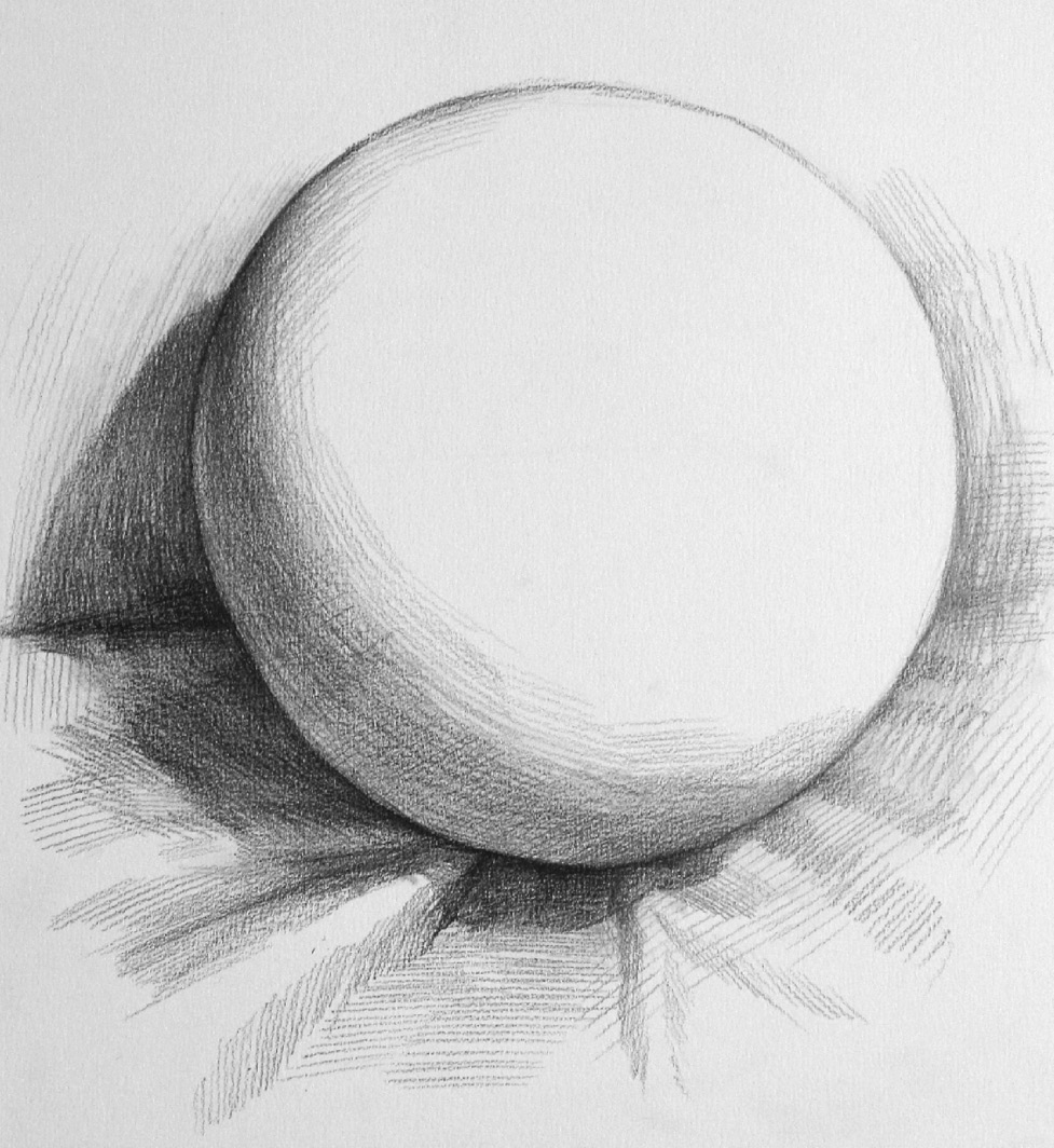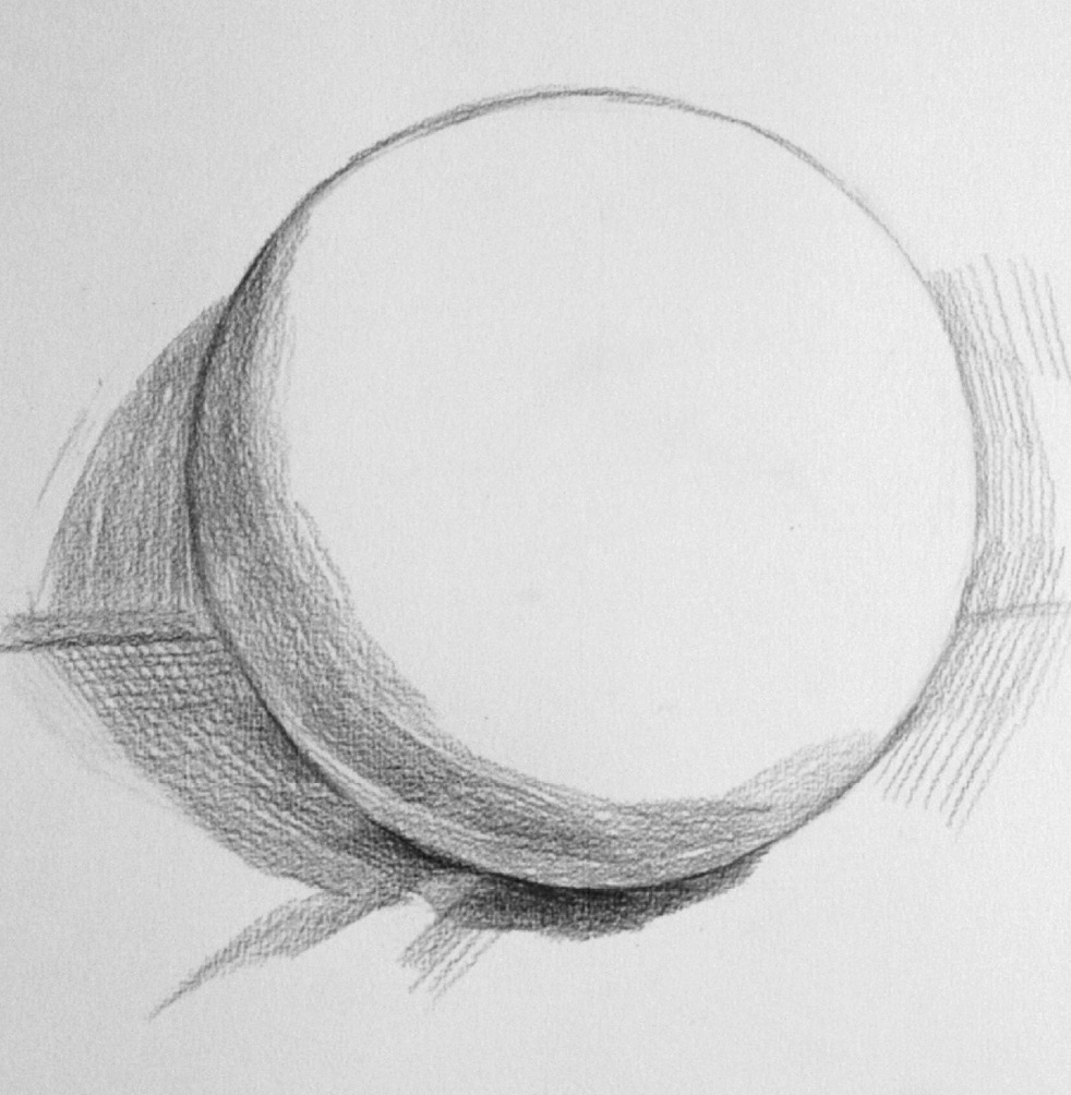 暗部处理 :选择一个位置,作为每一次刻画的起笔位置,本案例选择圆球体左上角的明暗交界线起点位置,每一次刻画都从此处下笔,顺着圆球体的形状向内用笔,顺着圆球体边线的形状向外画空间调子。本步骤的主要内容是通过暗部调子的轻重区别明确暗部的丰富变化。