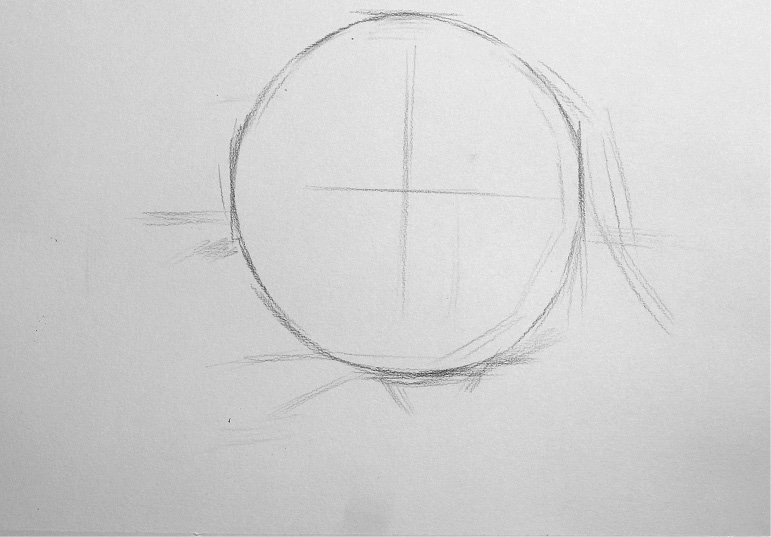 起稿 :先确定圆球体在画纸上的位置,选择上、下、左、右四个点,然后用直线切角的方式逐渐切出圆球体的形状,并画出投影和空间的位置。