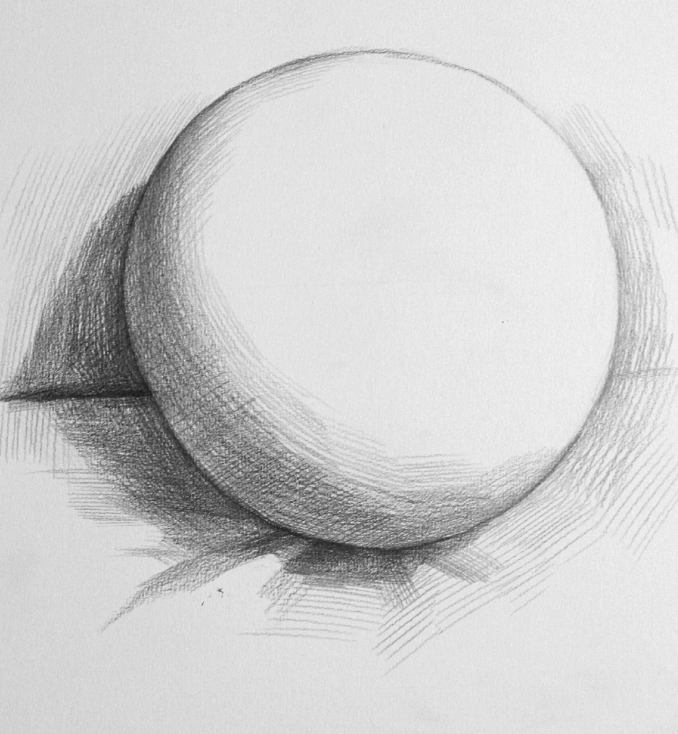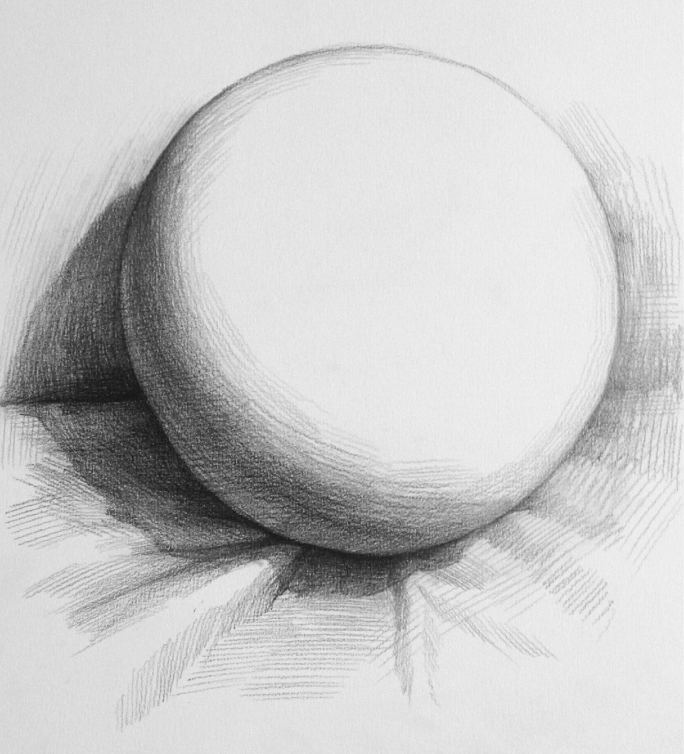 作品完成 :弱化环境细节,通过边线向内排调子刻画圆球体的体积感,从明暗交界线及轮廓线向高光位置推进,挤出高光,使用长线条统一暗部和细节,完成作品。