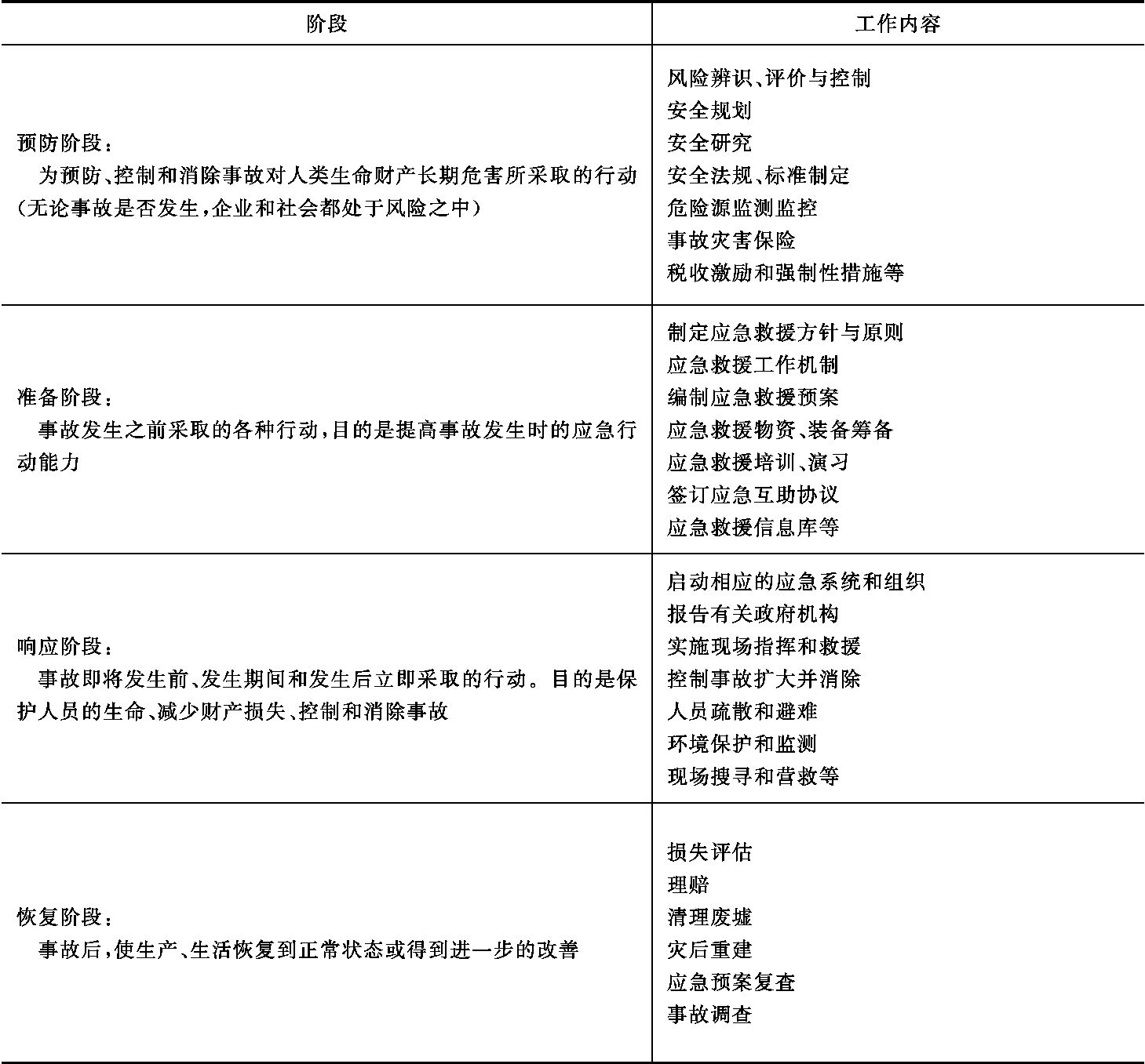 表3-1 事故应急救援管理过程4个阶段的工作内容