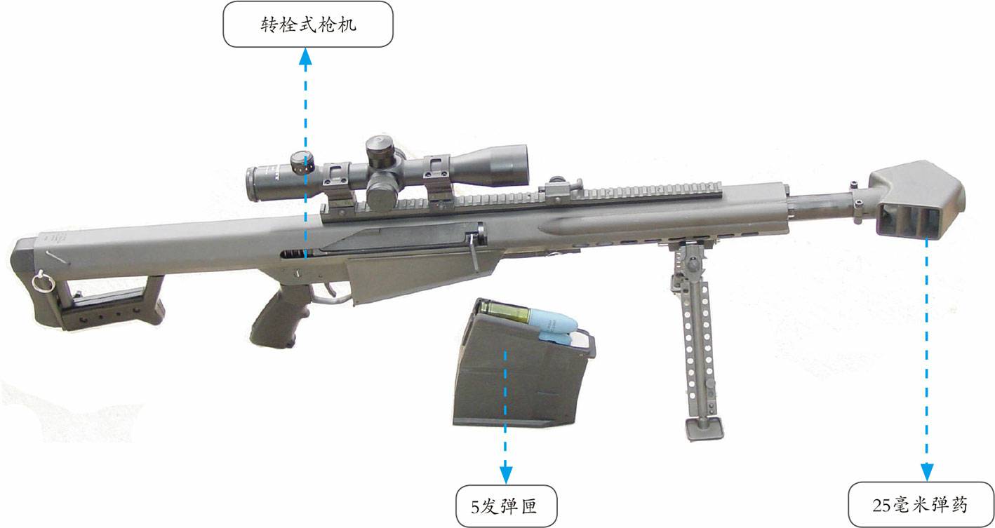 XM109狙击步枪是巴雷特公司设计制造的大口径狙击步枪,其威力惊人,具有攻击轻型装甲目标的能力。XM109狙击步枪的最大攻击距离可以达到2000米,其使用的25毫米口径弹药(由AH-64“阿帕奇”武装直升机上M789机炮使用的30毫米高爆子弹改进而来)至少能够穿透50毫米厚的装甲钢板,可以轻松地摧毁包括轻装甲车辆和停止的飞机在内的各种敌方轻型装甲目标。据称,这种25毫米口径弹药的穿透力是12.7毫米口径穿甲弹的2.5倍以上。