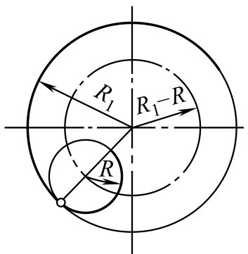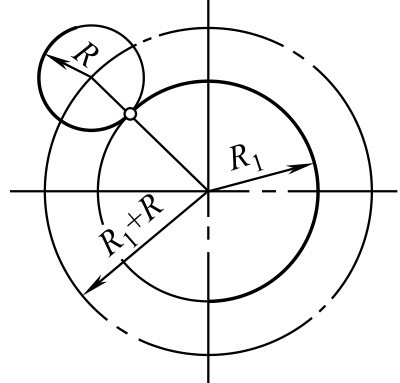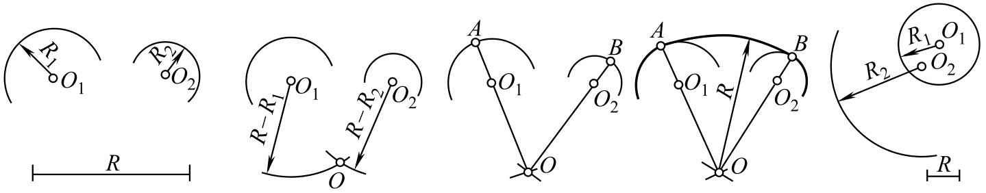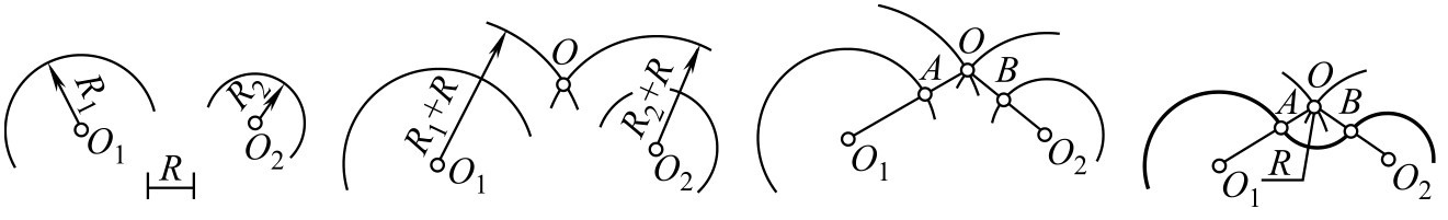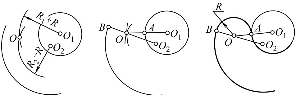 ②已知连接圆弧的半径为 R ,将此圆弧外切于圆心为 O 1 点,半径为 R 1 的圆;同时又内切于圆心为 O 2 ,半径为 R 2 的圆弧。