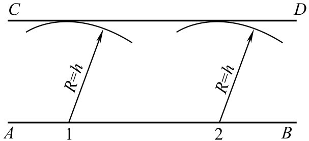 ①在直线 AB 上任取两点1、2为圆心,以 h 为半径分别画圆弧。