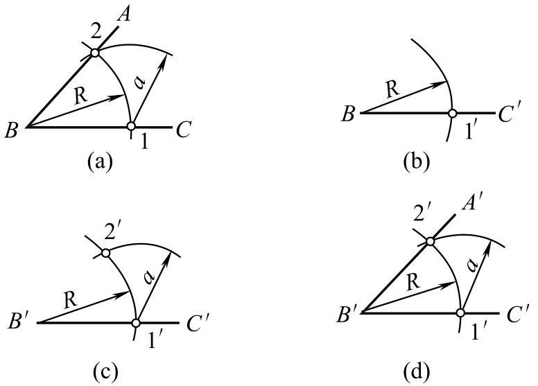 ①以 B 点为圆心,任意长度为半径画圆弧,交角的两边于1、2两点[图2-104(a)]。