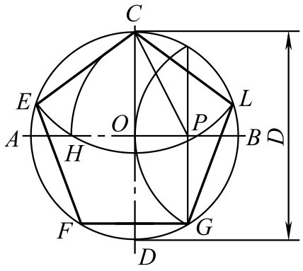 ③以 CH 为边长等分圆周,得 E 、 F 、 G 、 L 等分点,依次连接,即得正五边形,如图2-109所示。