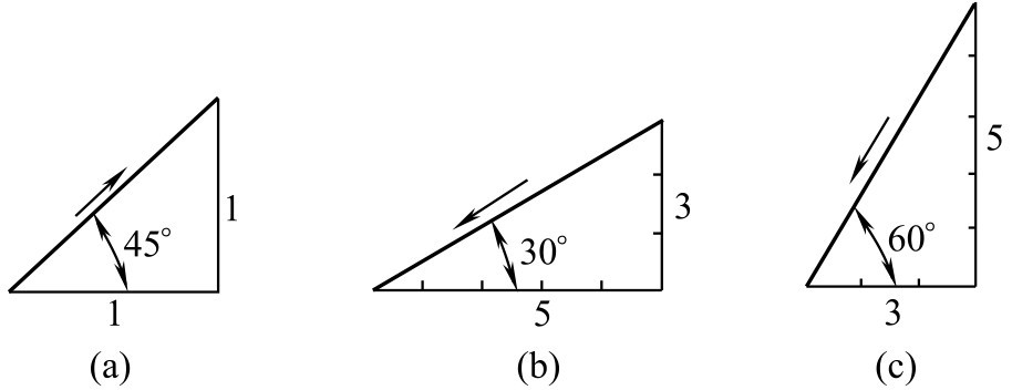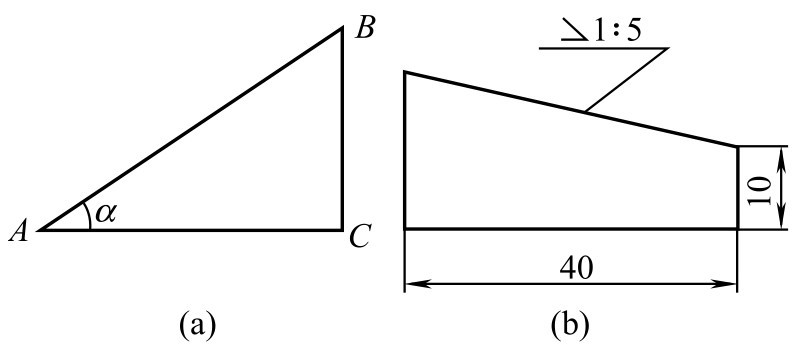 斜度是指一直线(或平面)对另一直线(或平面)的倾斜程度。在图2-110(a)中, AB 边对 AC 边的斜度用 BC 边与 AC 边的比值表示,即 AB 对 AC 的斜度= BC / AC =tan α =1: n 。