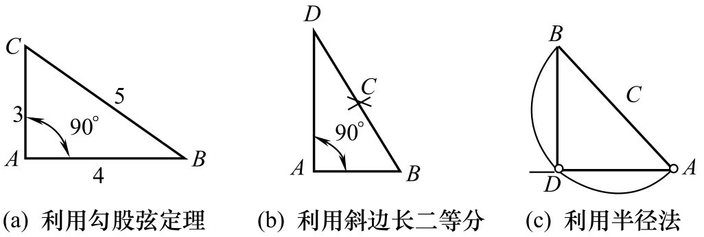 ①利用勾股弦定理(即勾3、股4、弦5)画直角,如图2-101(a)所示。