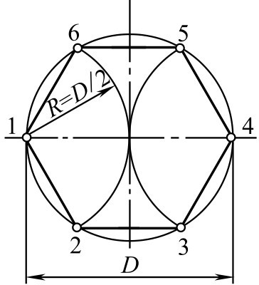 ①用圆的半径六等分圆周。当已知正六边形对角距离(即外圆直径)时,可用此法画出正六边形,如图2-107所示。