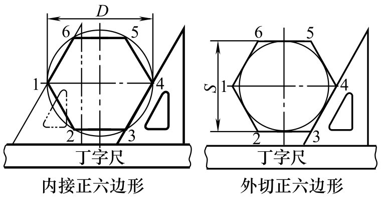 ②用丁字尺、三角板配合作圆的内接、外切正六边形,如图2-108所示。