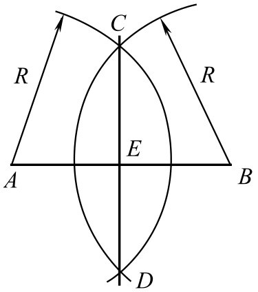 铆工作业中,对某些巨大的金属结构,如大型储气罐的罐顶,放样时会遇到作特大圆弧的问题,即知罐体的直径(弦长) AB 和罐顶拱高(弧弦距) h 。两种大圆弧的近似作法介绍如下。