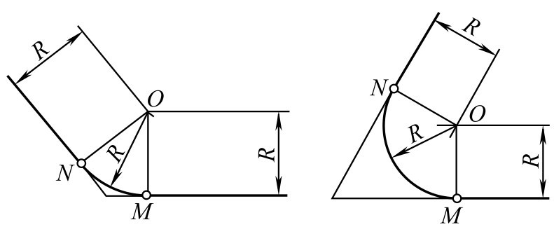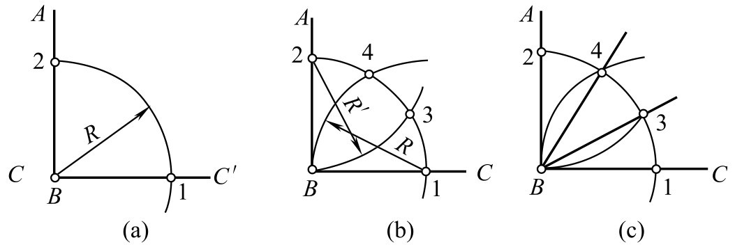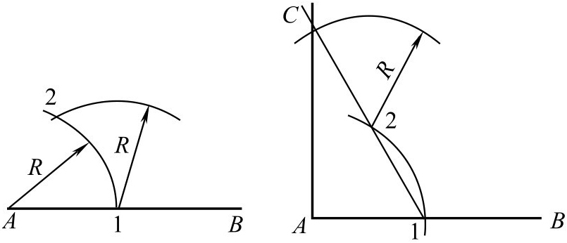①以 B 点为圆心,取 R 长为半径画圆弧,交两边于1、2点[图2-103(a)]。