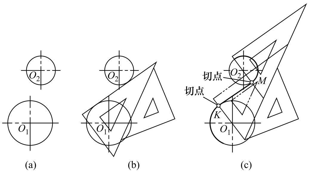b.沿第二块三角板推动第一块三角板,当另一直角边通过圆心 O 1 、 O 2 时,分别作直线,与圆相交得 K 、 M 点,连接 K 、 M 即作出内公切线,如图2-126(c)所示。