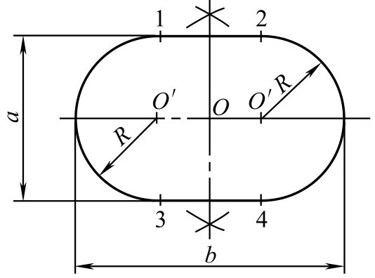 已知腰子圆的短轴 a ,长轴 b 。作法如图2-129所示。