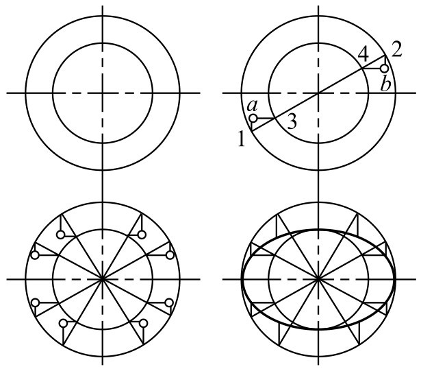②过圆心作任意直线交大圆于1、2两点,交小圆于3、4两点,分别过1、2点引垂线,过3、4点引水平线,它们的交点 a 、 b 即为椭圆上的点。
