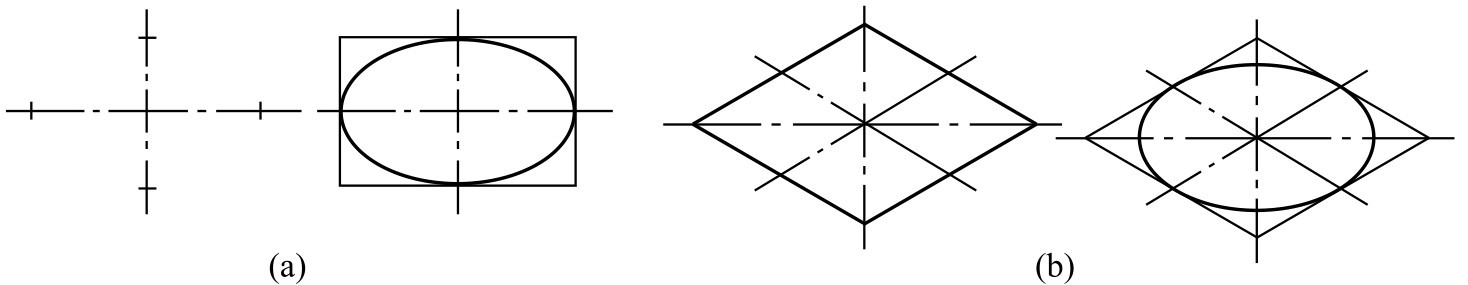 ⑤椭圆的画法 画椭圆时,先画椭圆长、短轴,定出长、短轴顶点,过4个顶点画矩形,然后作椭圆与矩形相切,如图2-140(a)所示;或者利用其与菱形相切的特点画椭圆,如图2-140(b)所示。