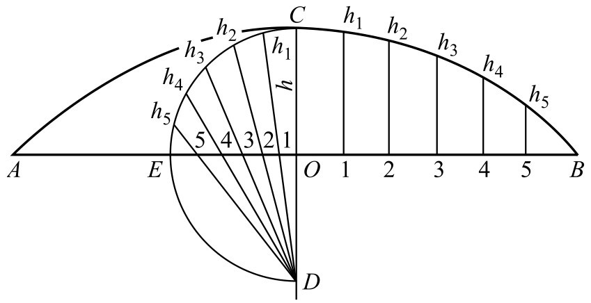 ④分 AB 弦为与半圆的同数(12)等分,并过等分点作垂线,在各垂线上取对应等于 h 5 —5、 h 4 —4、 h 3 —3、 h 2 —2、 h 1 —1的距离,得到各点。
