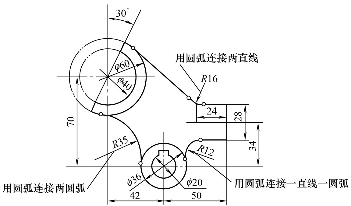 ③连接线段 只有定形尺寸而没有定位尺寸的线段称为连接线段,如图2-134中的 R 40为连接线段。