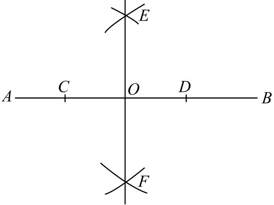 ②分别以 C 、 D 为圆心,以任意半径画弧,相交于 E 、 F 两点。