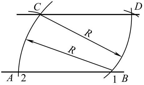 已知 AB 直线,作一平行于 AB 的直线 CD ,两条平行线间距为 R 。作法如图2-93所示。