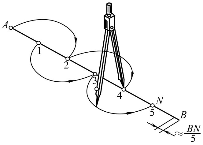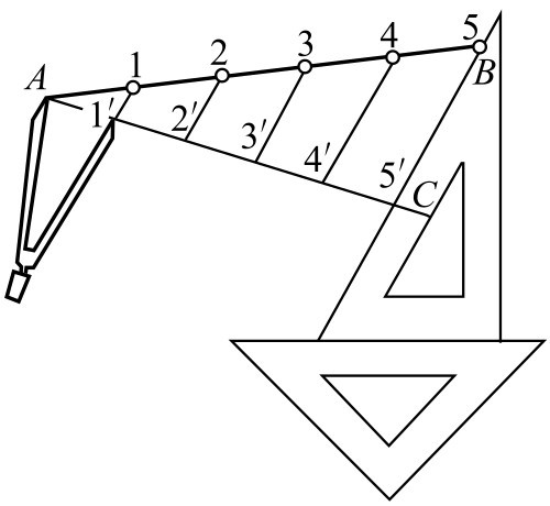 c.连接5′ B ,并分别过4′、3′、2′、1′各点作5′ B 的平行线,在 AB 线上即得4、3、2、1各等分点。