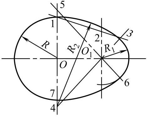 ②连接1、2两点,并延长交于 R 1 圆弧上3点,连接3、 O 1 ,并延长交于4点。