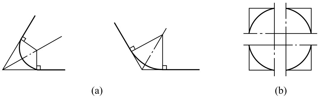 ④圆角及圆弧连接的画法 画圆角及圆弧连接时,根据圆角半径大小,在分角线上定出圆心位置,从圆心向分角两边引垂线,定出圆弧的两连接点,并在分角线上定出圆弧上的点,然后过这3点作圆弧,如图2-139(a)所示;也可以利用圆弧与正方形相切的特点画出圆角或圆弧,如图2-139(b)所示。