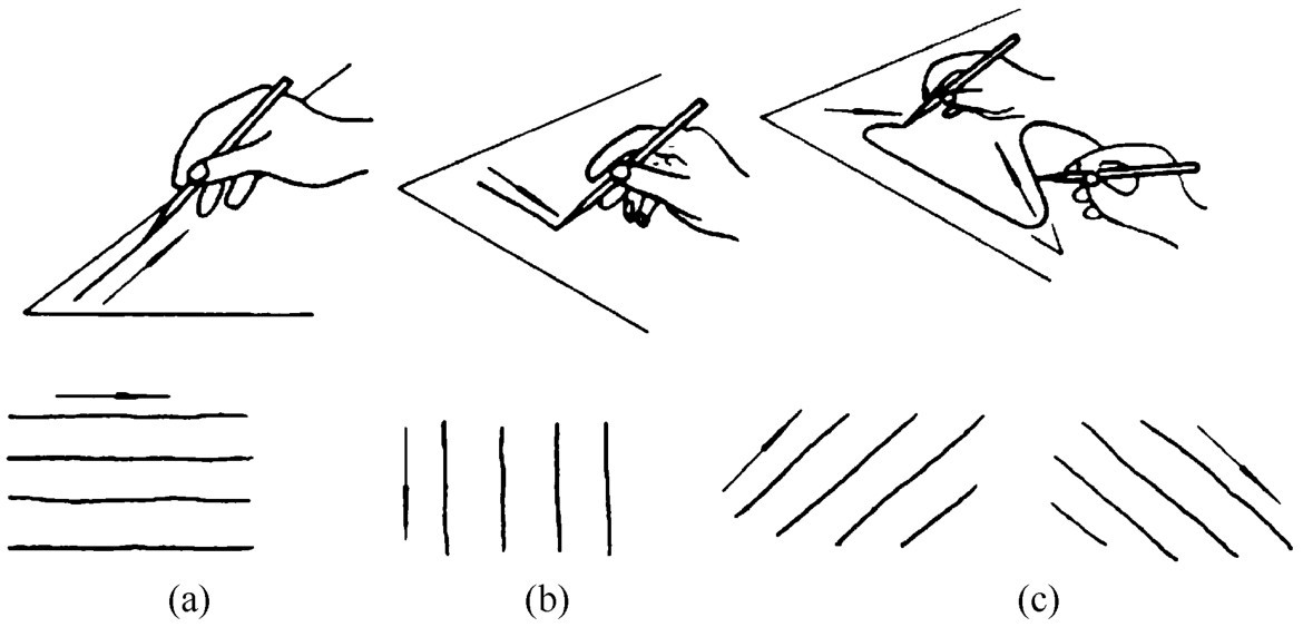 ①直线的画法 画直线时,可先标出直线的两端点,手腕靠着纸面,眼睛注视线段终点,匀速运笔一气完成。画水平线时,为了便于运笔,可将图纸斜放,如图2-136(a)所示;画垂直线应自上而下运笔,如图2-136(b)所示;画斜线时,可以调整图纸位置,使其便于画线,如图2-136(c)所示。