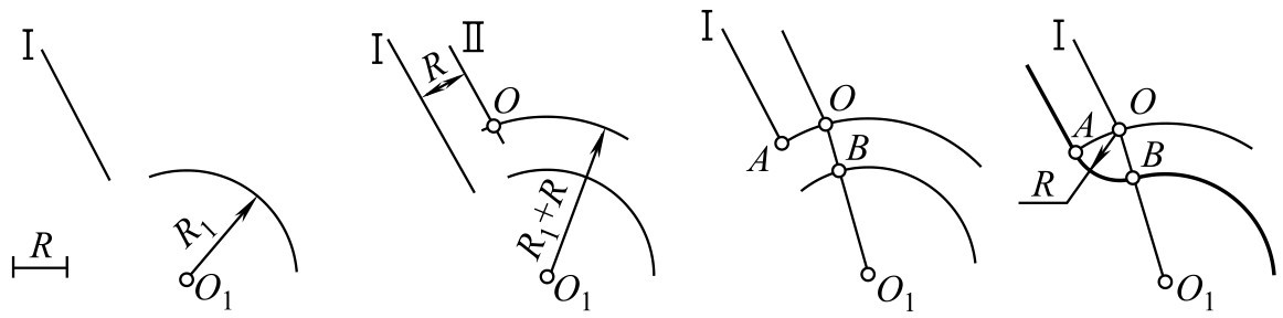 b.连接 OO 1 交已知圆弧于 A 点;连接 OO 1 并延长交已知圆弧于 B 点, A 、 B 即为切点。