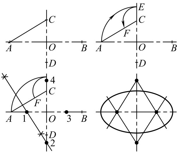 ①画出长轴 AB 和短轴 CD 。连接 AC 。
