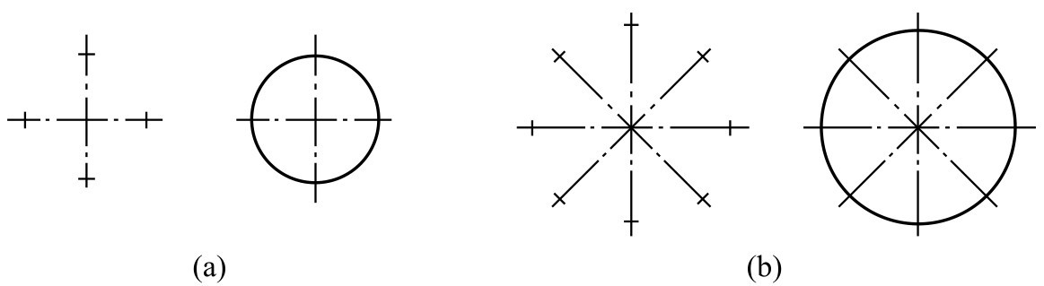 ③圆的画法 画直径较小的圆时,先在中心线上按半径大小目测定出四点,然后徒手将这4点连接成圆,如图2-138(a)所示;画较大圆时,可通过圆心加画两条45°的斜线,按半径目测定出八点,然后连接成圆,如图2-138(b)所示。