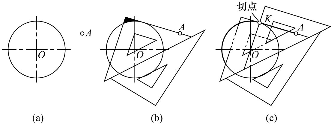 b.沿第二块三角板推动第一块三角板,直至另一直角边通过圆心时作直线,其与圆相交得切点 K ,连接 A 、 K 即作出切线,如图2-125(c)所示。