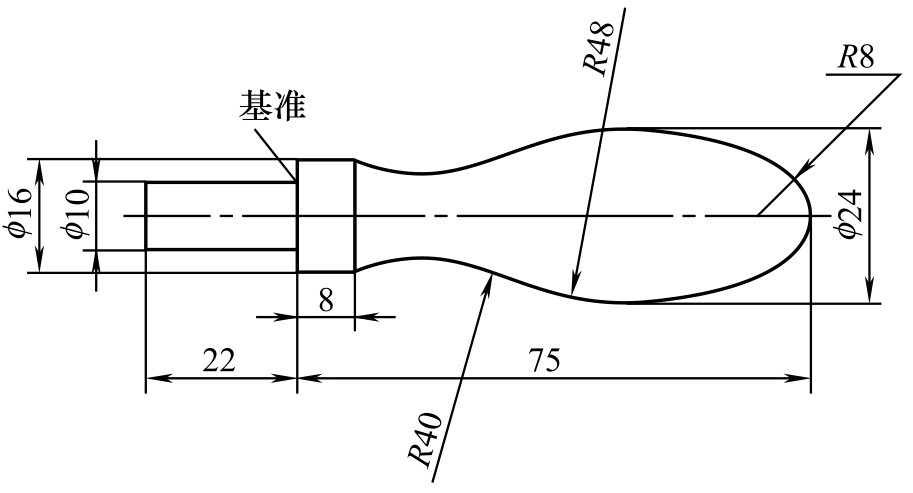 ②定位尺寸 用以确定平面图形中各组成部分之间相对位置的尺寸称为定位尺寸。如图2-134中,75是 R 8圆弧的定位尺寸, ф 24是 R 48圆弧的定位尺寸。