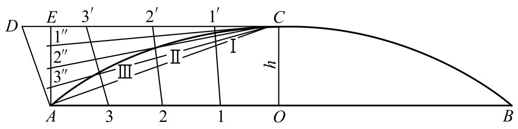 ④上述两组线的对应交点Ⅰ、Ⅱ、Ⅲ,与 A 、 C 点,用光滑的曲线连接,即得到较准确的大圆弧。
