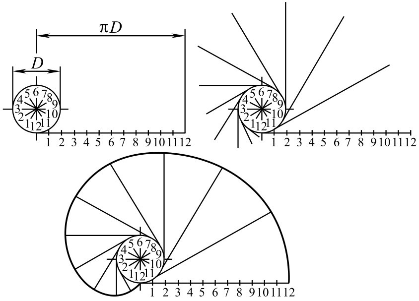 ①将基圆 D 分成任意等分,并将基圆的展开长度π D 也分成相同的等分(图中为12等分)。