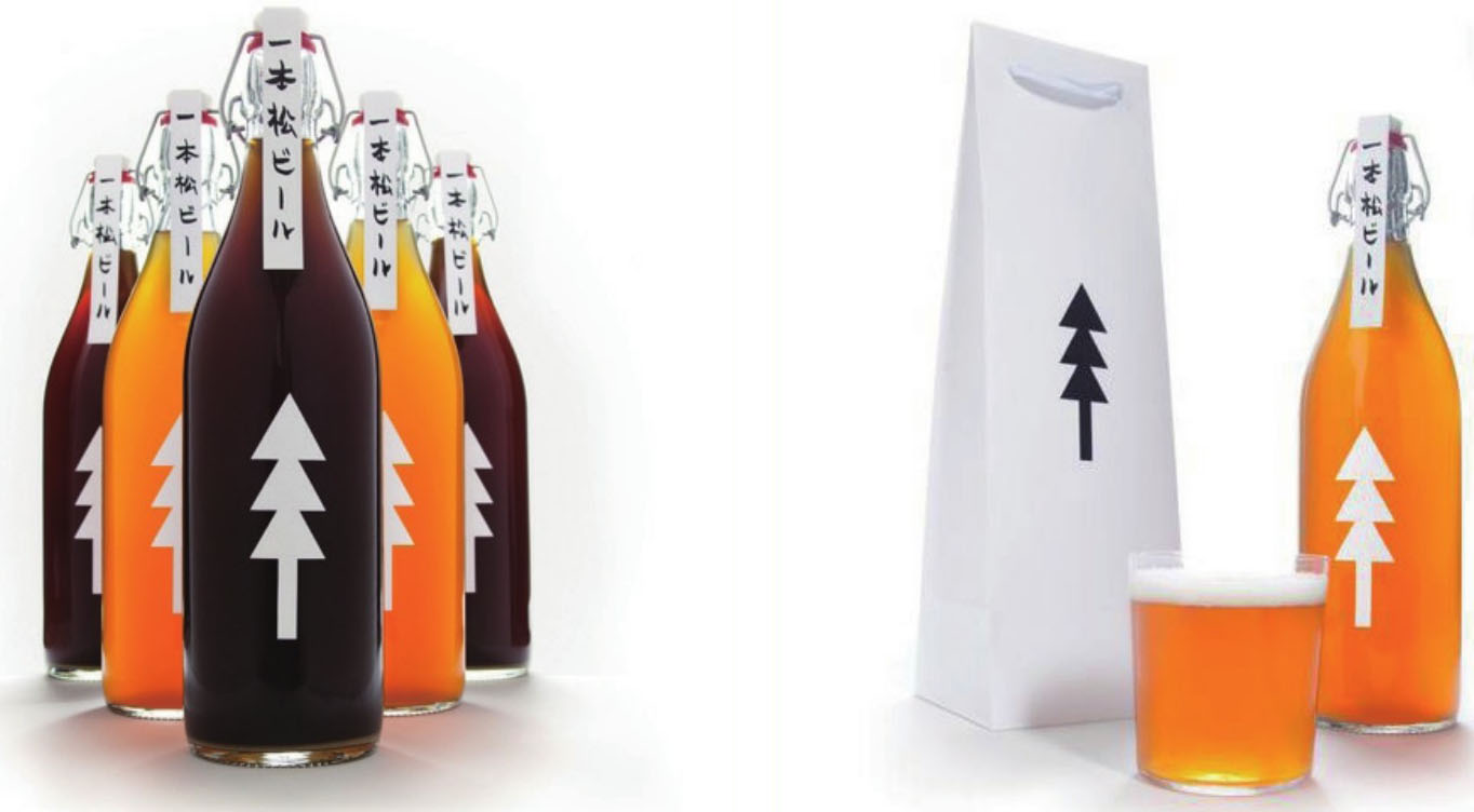 来自日本包装设计师Kota Kobayashi的作品——One Pine Tree松树啤酒,松树代表2011年海啸后的生存证明。该标签是一棵孤独的松树,由三个朝上的三角形组成;黑白两色为日本设计中常用色,象征着灾后重建工作快速进展的愿望(见图1.9所示)。