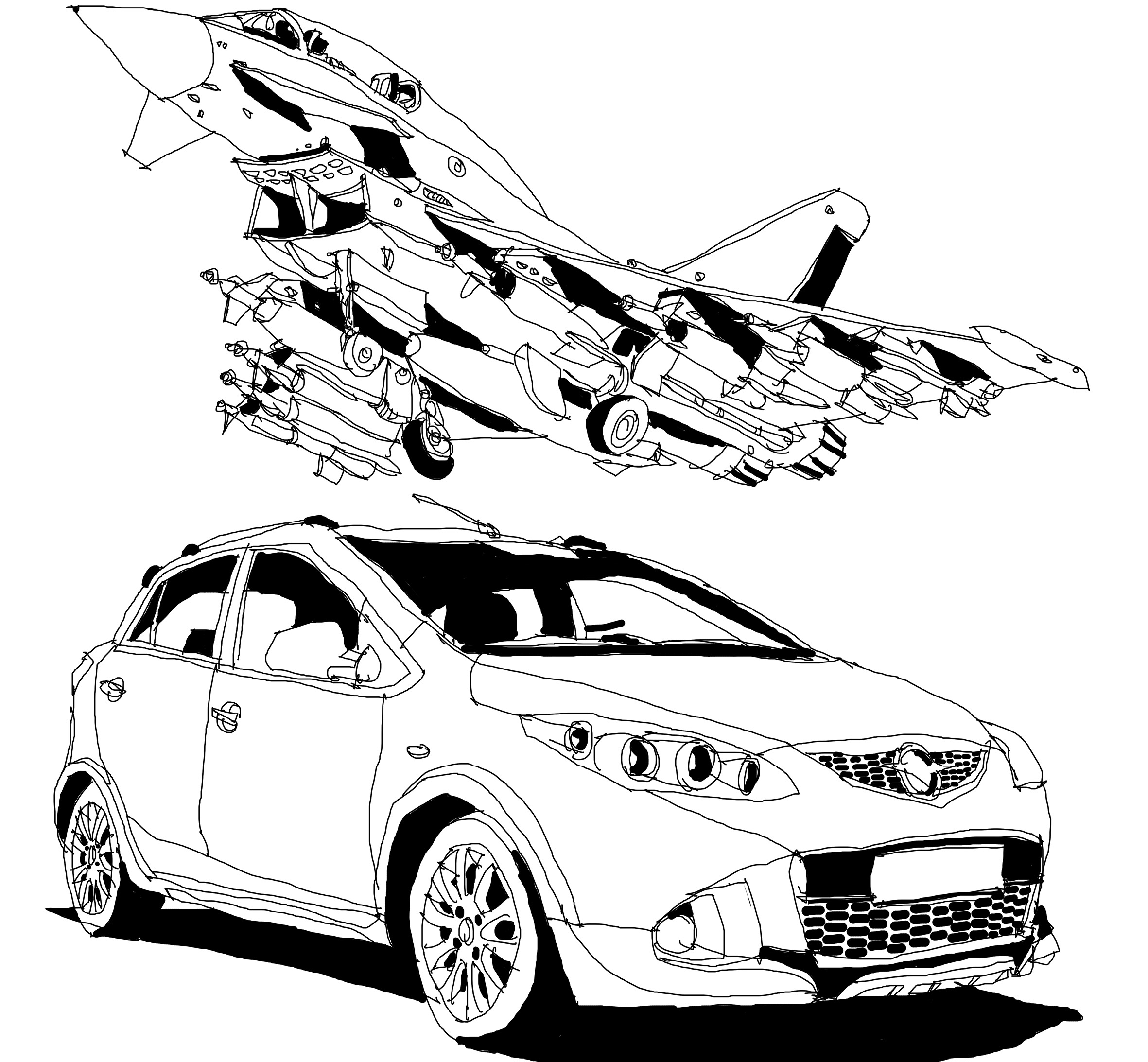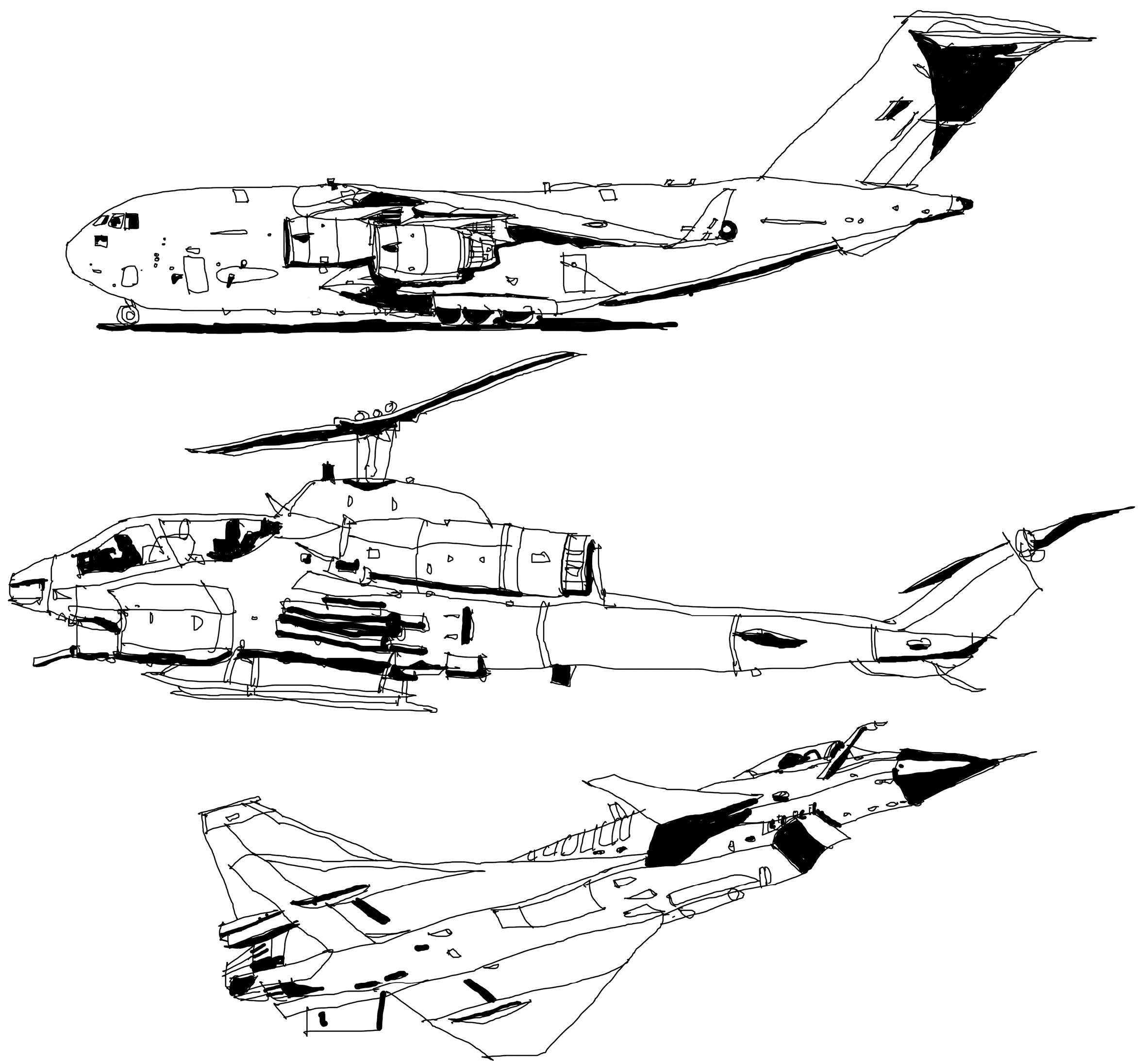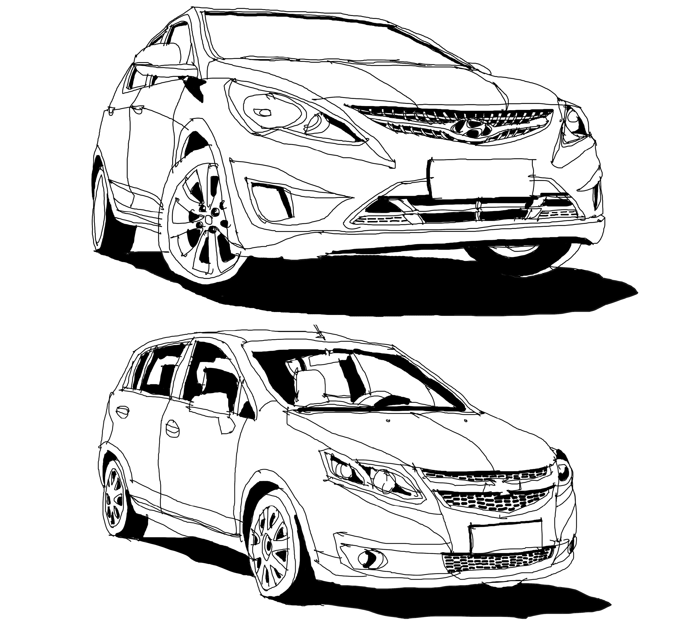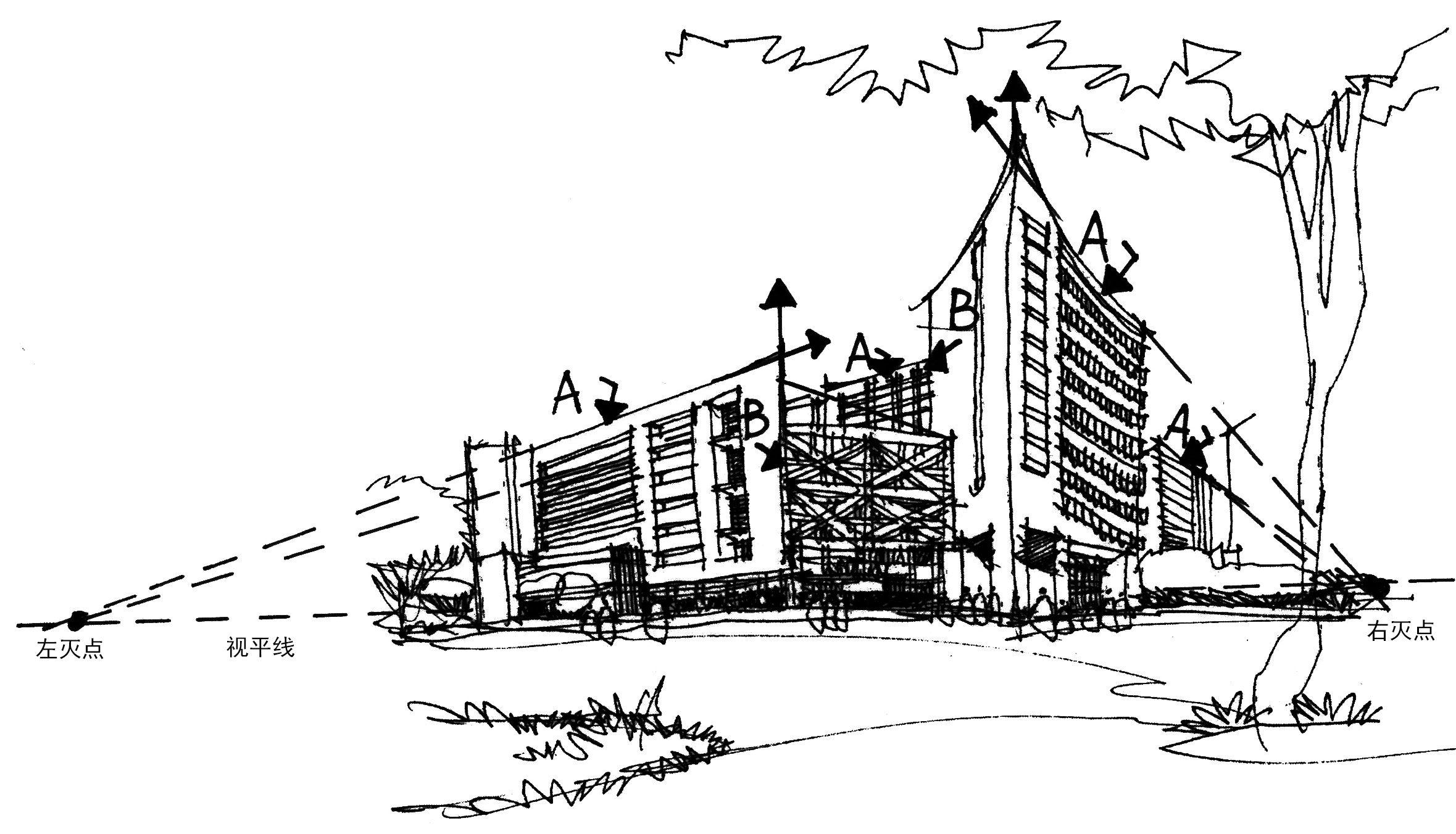 在两点透视空间中,所有向左倾斜的A线条都相交于视平线中的左灭点上,所有向右倾斜的A线条都相交于视平线中的右灭点上,所有类似于B线条的垂直线都保持原来的垂直状态。