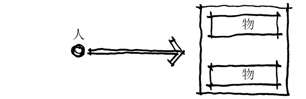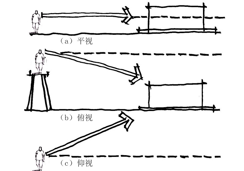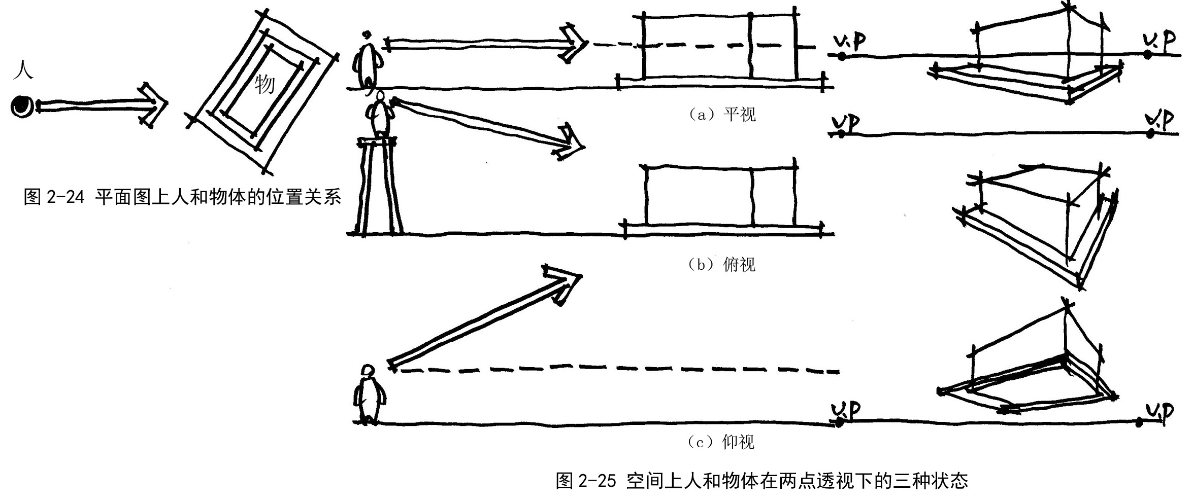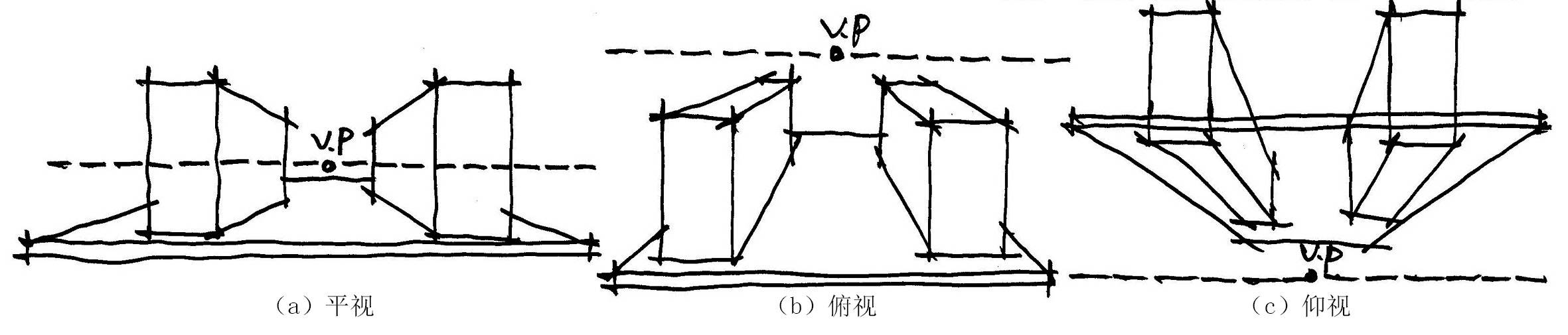 图2-17 空间上人和物体三种状态下的一点透视情况