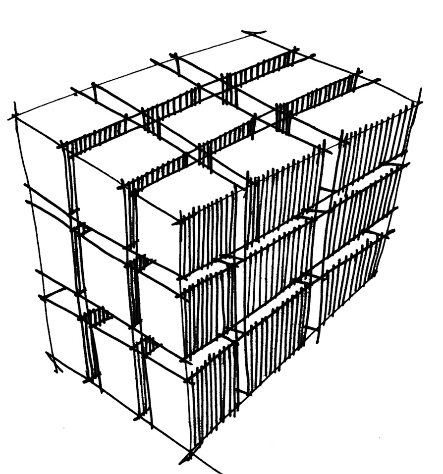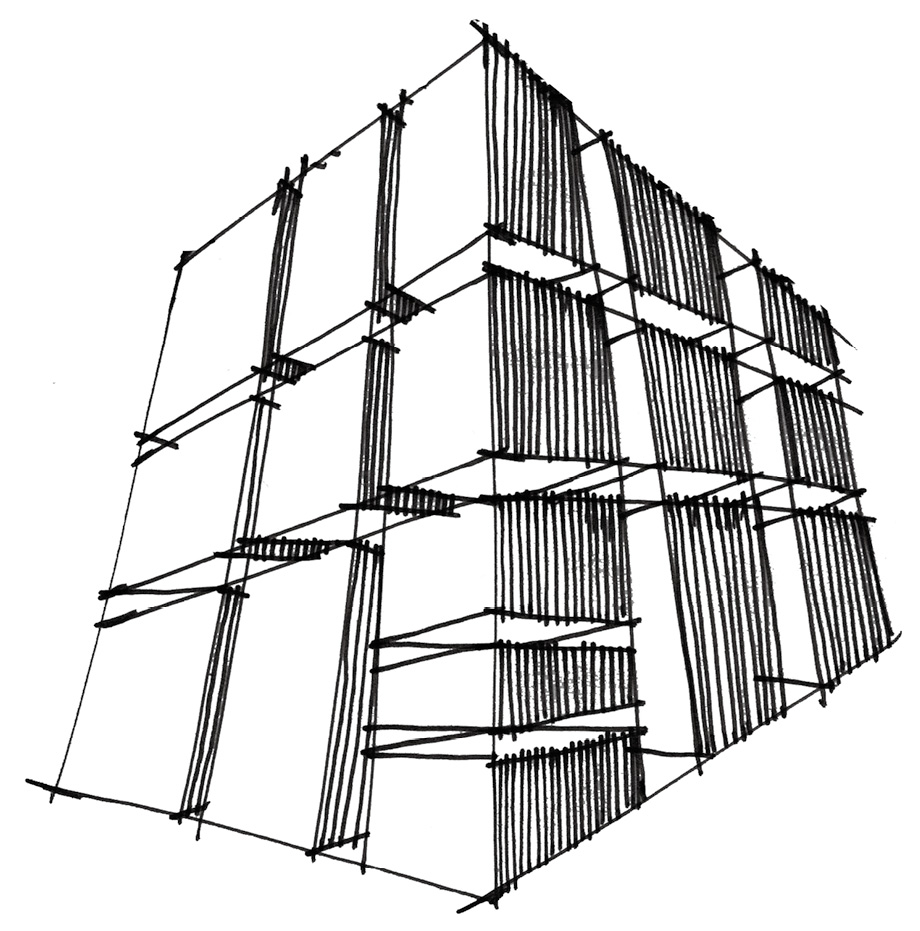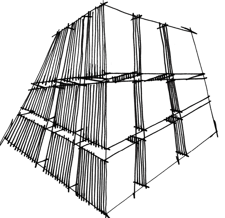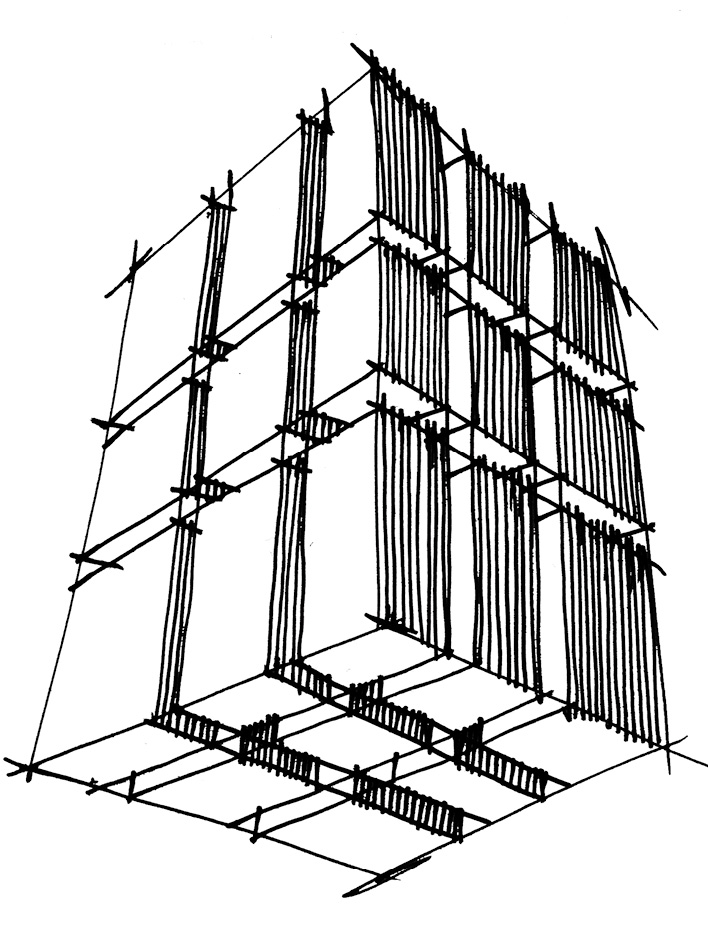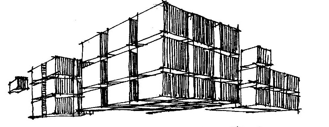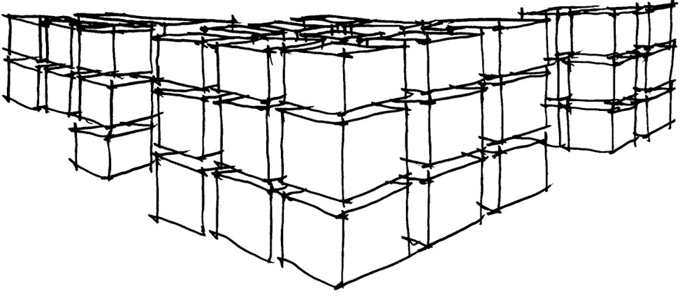(3)三点透视。三点透视拥有三个透视灭点,因人所站立观看的方向与物体之间的不同关系,三点透视可大概分为四种不同的类型。其常常是人们对超高层建筑进行俯视或鸟瞰视图时的透视变形。